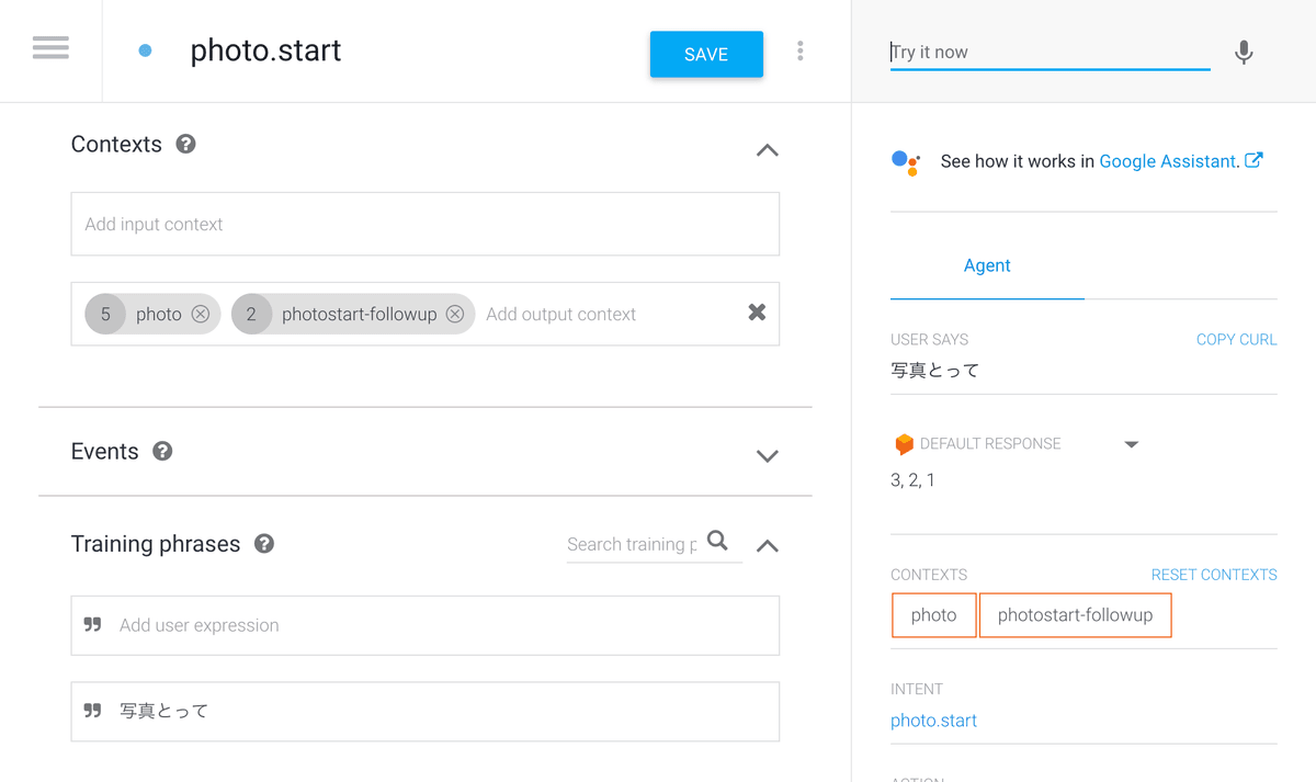 見慣れない用語が出てきて Dialogflow 躊躇してしまいますが WEB 上で動作テストも出来るので一旦作ってみると理解が早いかもしれません。まずは音声コマンドのアプリ部分を作成します。